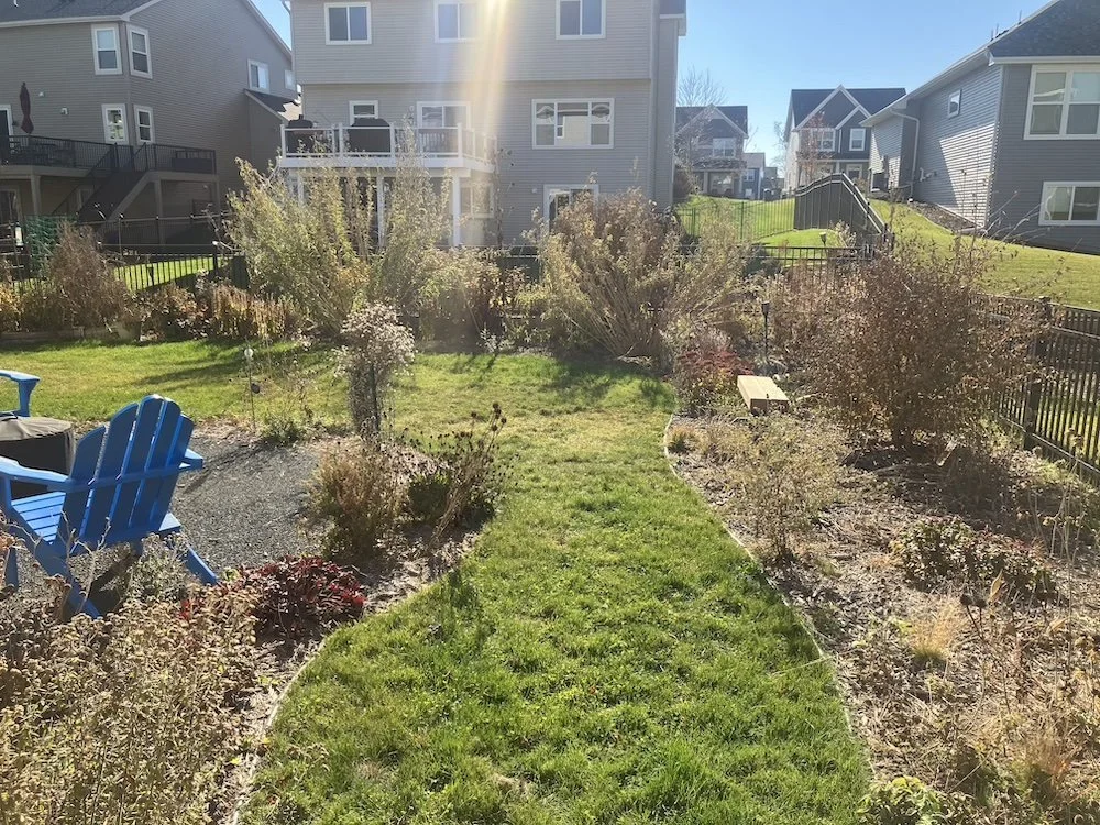 This yard had some major drainage issues, so plant selection was important to ensure that species could survive wet soils and also seasonal drought. Taller, billowy wildflowers, small trees and shrubs provide screening from the very close neighbors, and fall+winter structure brings appeal to an otherwise stark season.